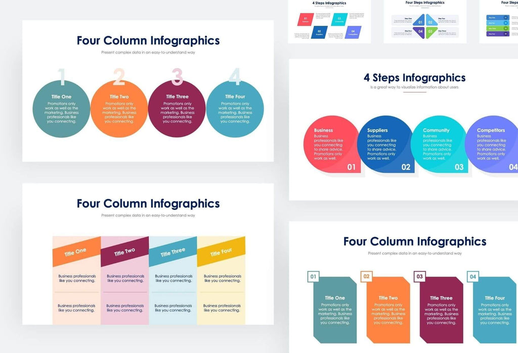 Transform your business presentations with this expertly crafted collection of 4-step infographic templates for PowerPoint. The templates feature a clean, minimalist design approach that uses a harmonious blend of soft pastels and professional color schemes to guide your audience through each stage. From flowing arrows and connected circles to sleek geometric shapes, each layout offers a unique way to visualize your four-step processes without overwhelming your viewers.