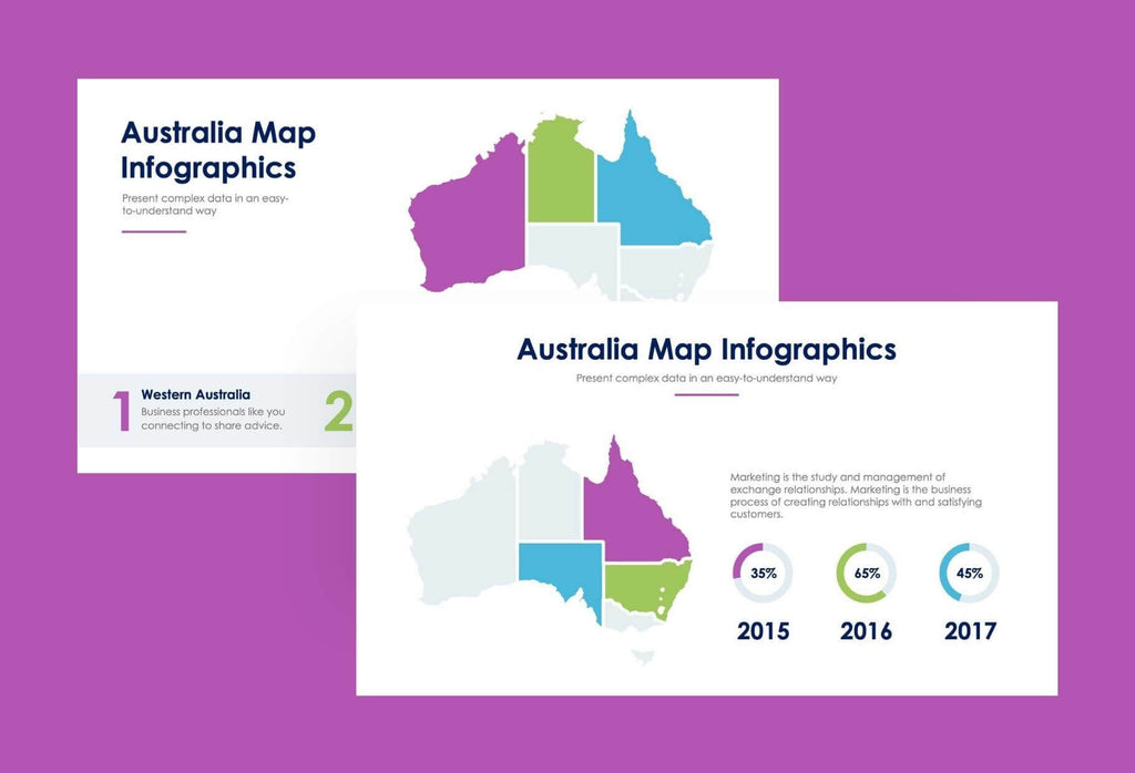 Today, we've handpicked a fantastic collection of Australia map PowerPoint infographic templates that will help you create stunning presentations about regional statistics, demographic data, market analysis, or any Australia-focused content.
